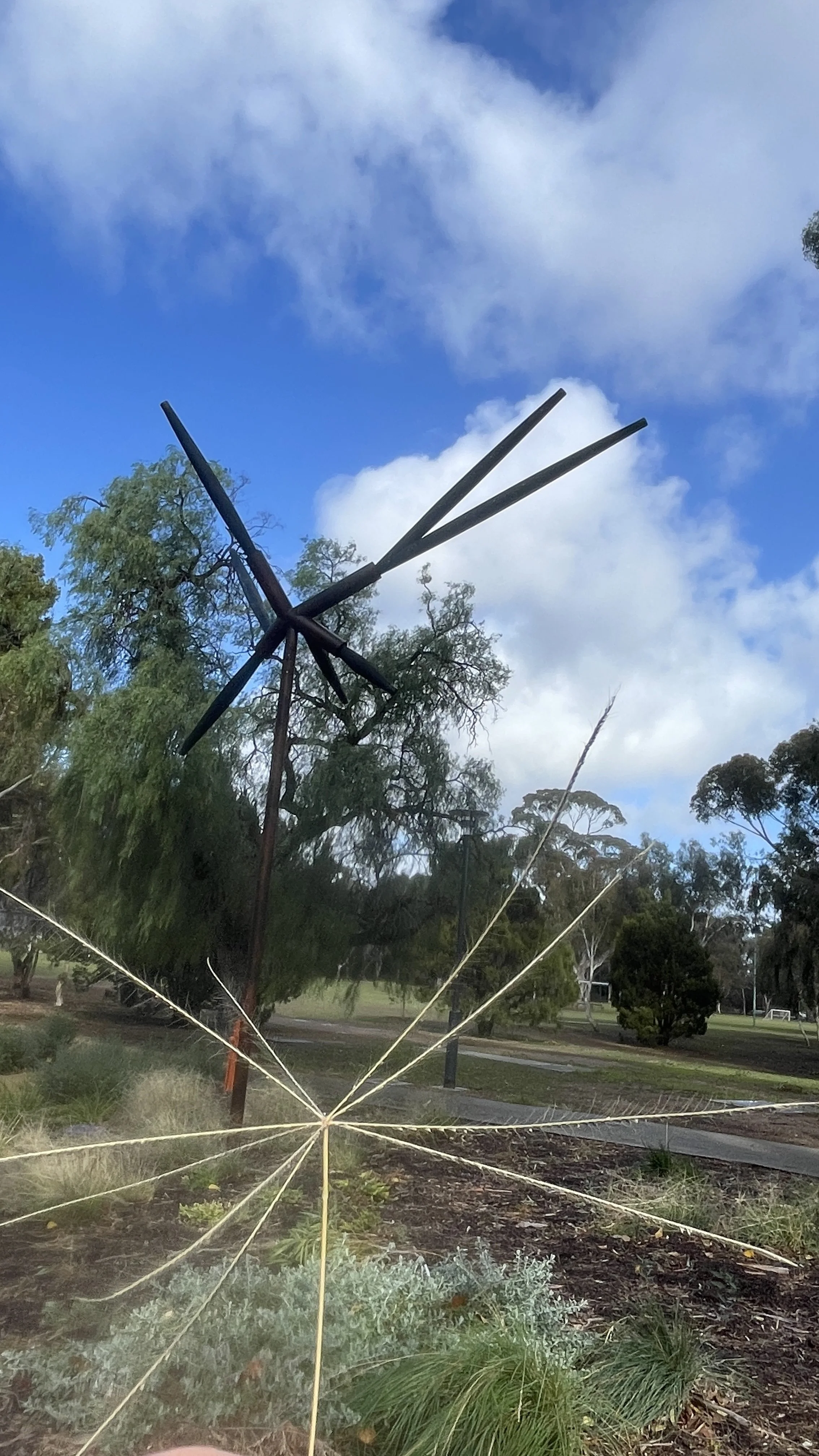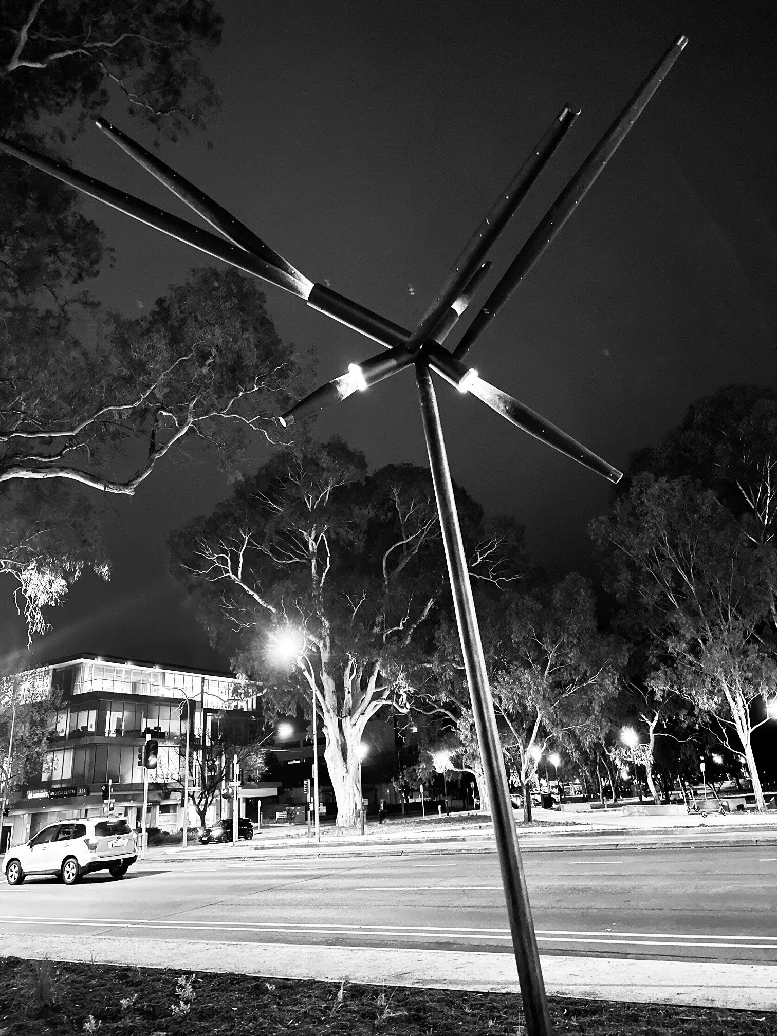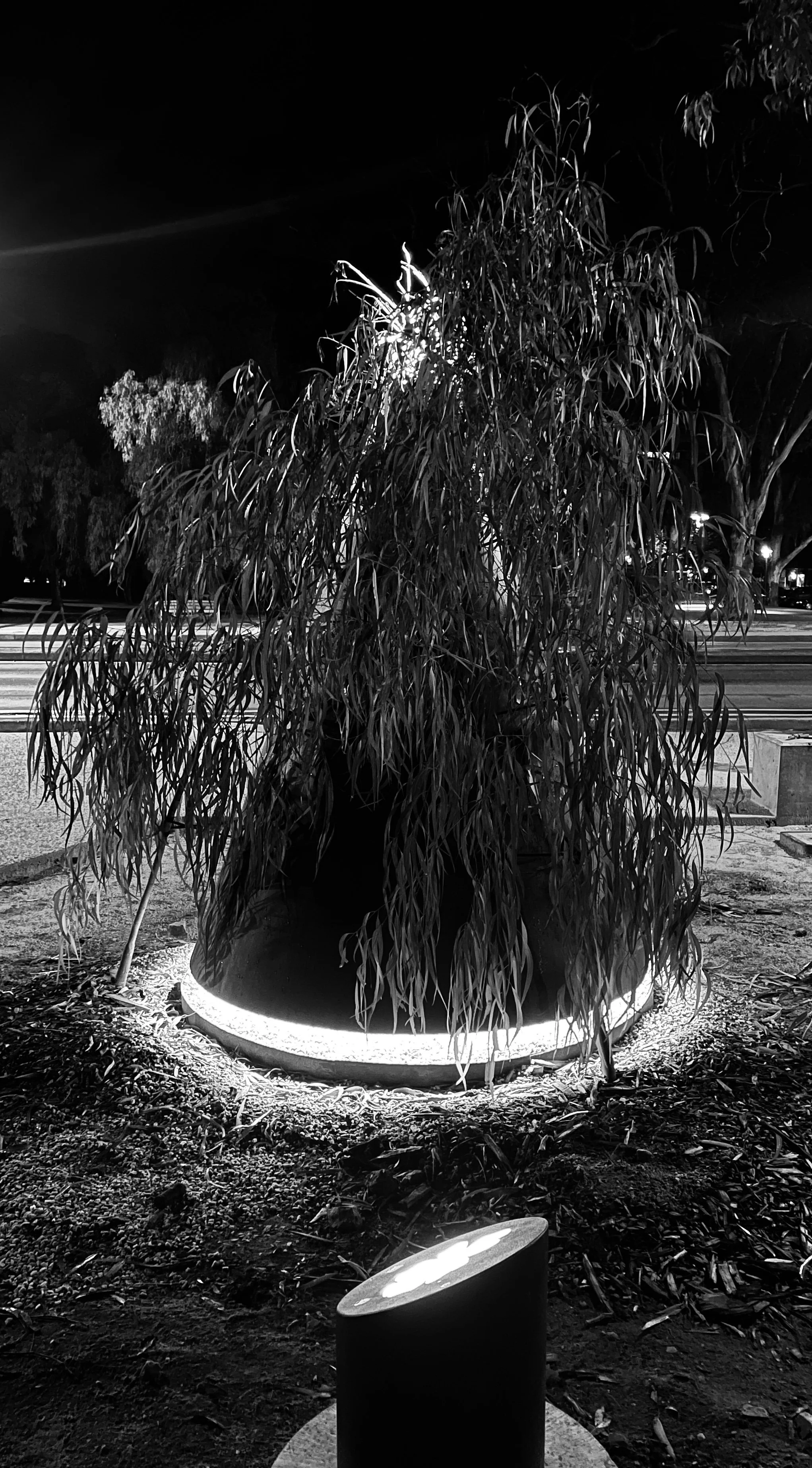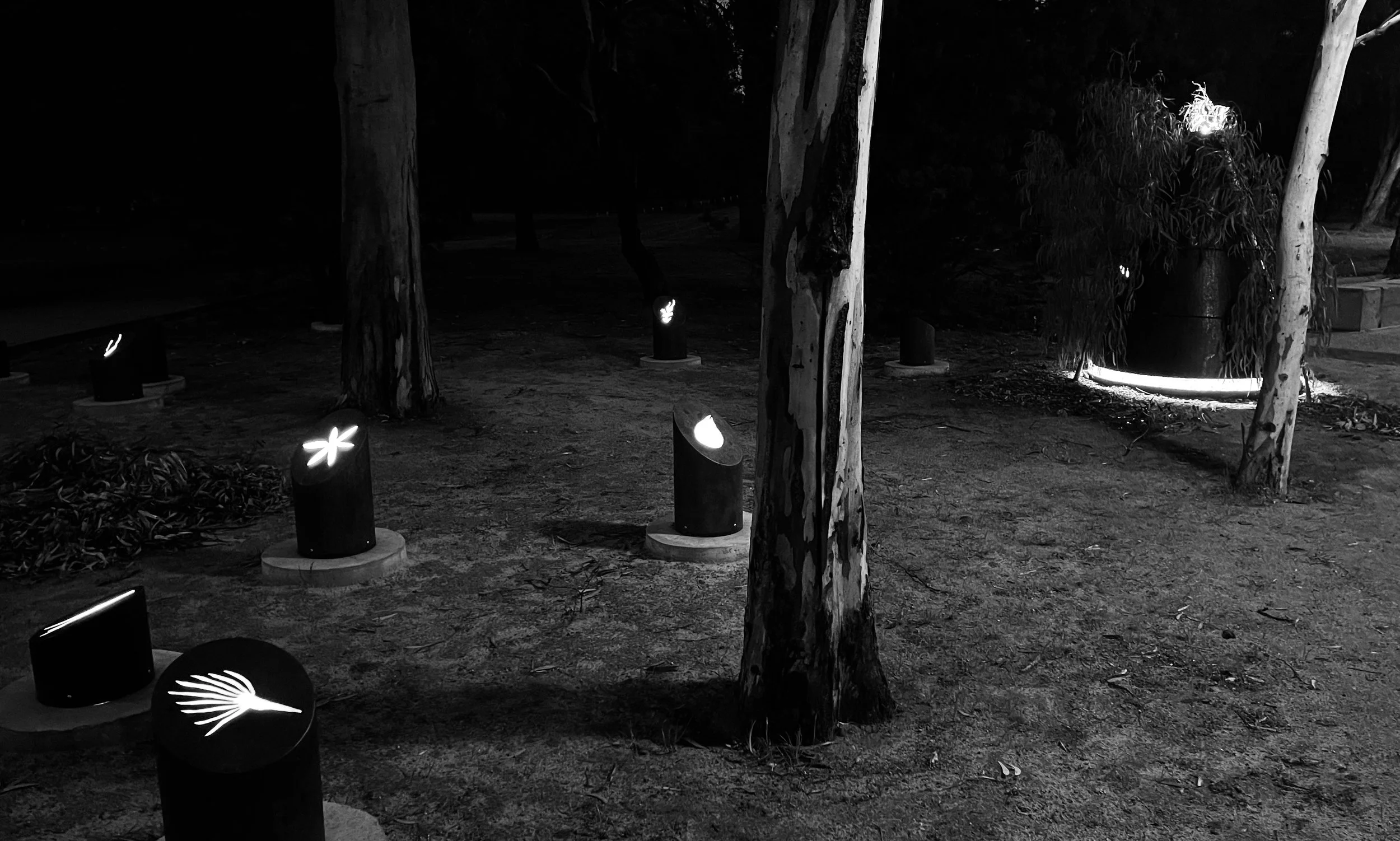 Each of the works are living artworks, with plantings of native grasses and shrubs being integral elements of Windmill and Seed Discs. In time the illuminated Seed Discs will float in a sea of native foliage.Young Living is an experimental work encouraging three dwarf lemon scented gums (Corymbia citrodora Scentuous) to fuse through the natural process of inosculation.