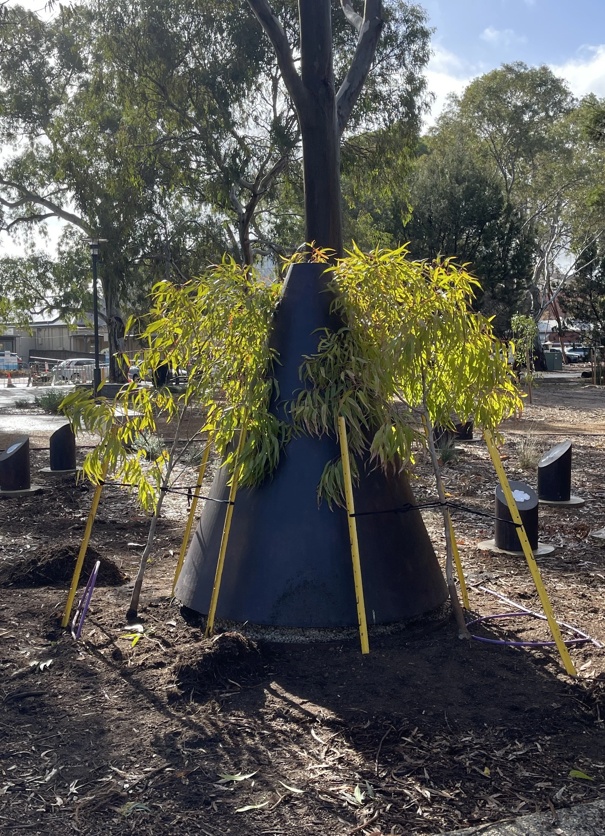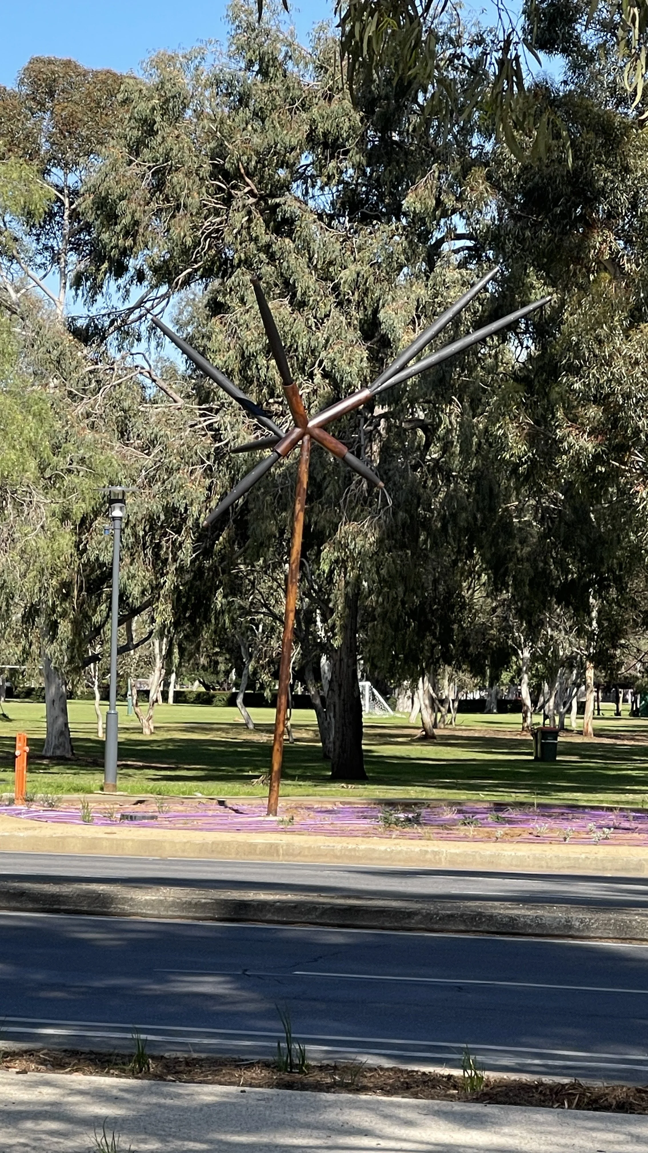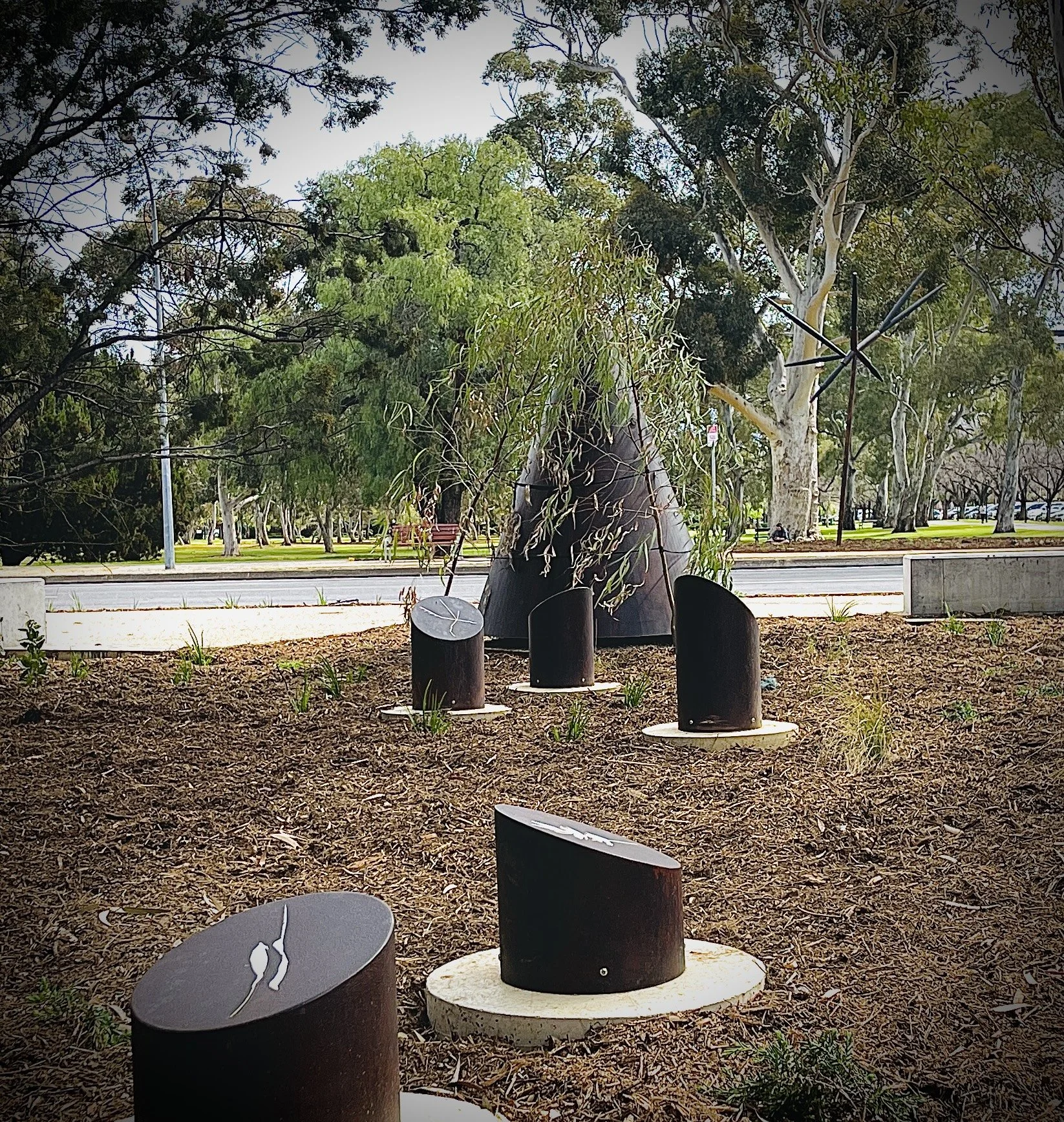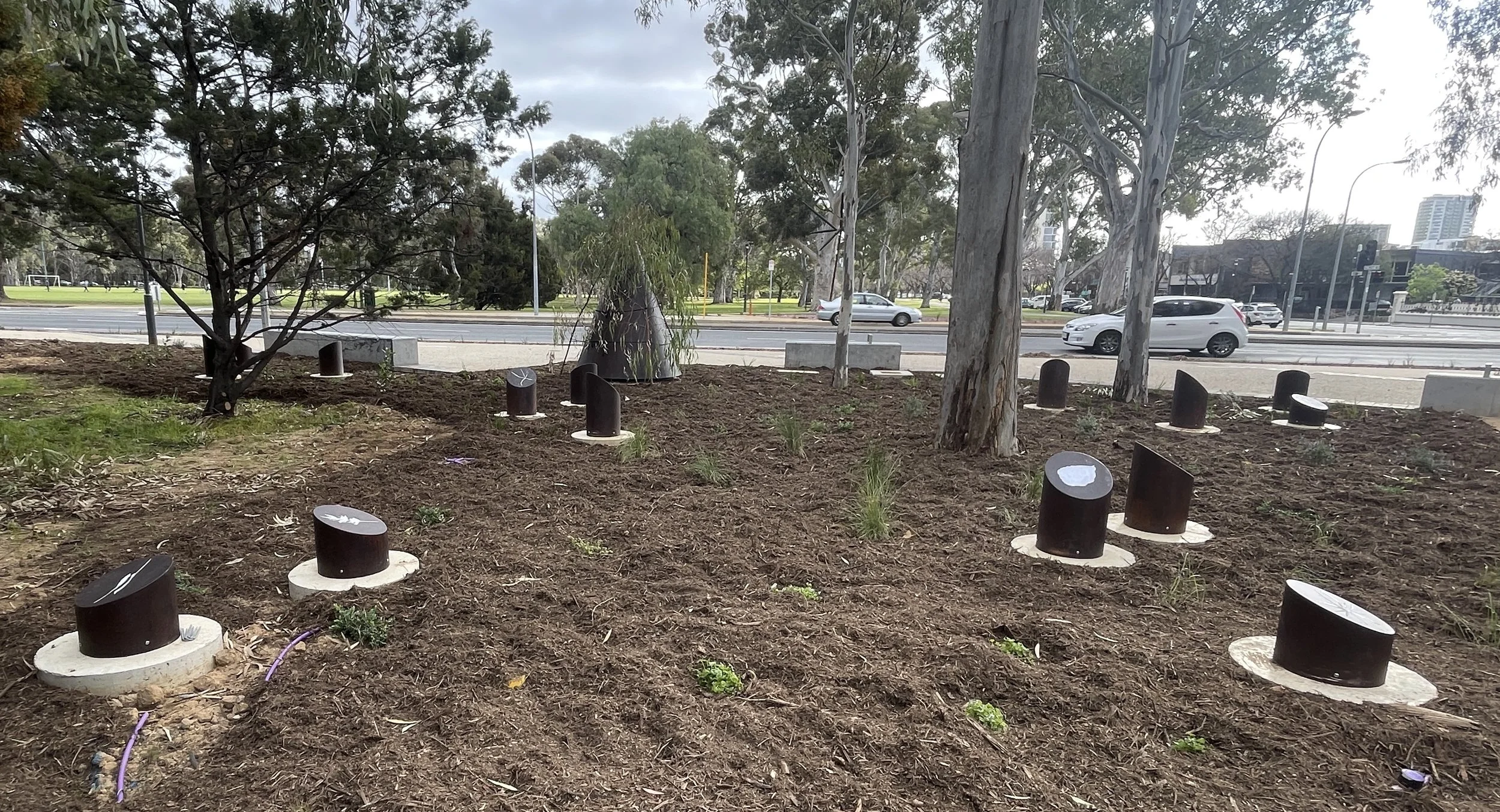Consisting of three elements, Young Living, Seed Discs, and Windmill, the artworks were commissioned by the Adelaide City Council for the Hutt Street Entryway.Young Living symbolizes growth and transformation, inviting the public to witness the organic fusion of eucalyptus saplings over the course of time for generations to come. Seed Discs illuminate the native grass seeds, paying homage to the land's endemic flora while Windmill bridges cultural narratives with environmental awareness.